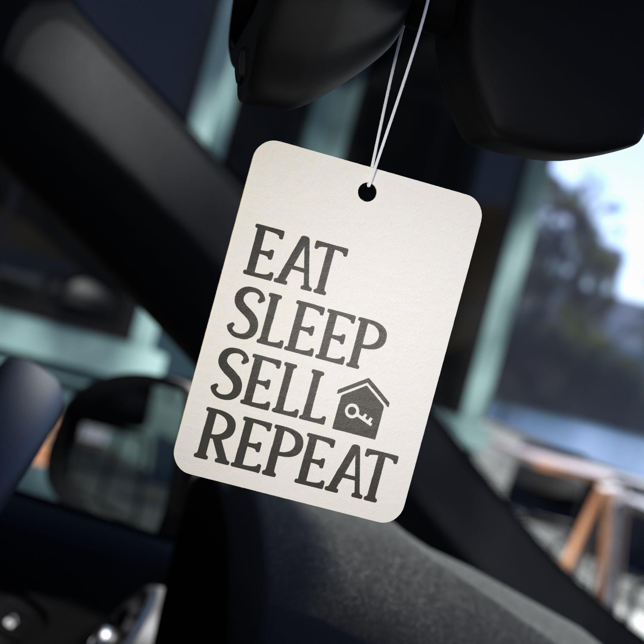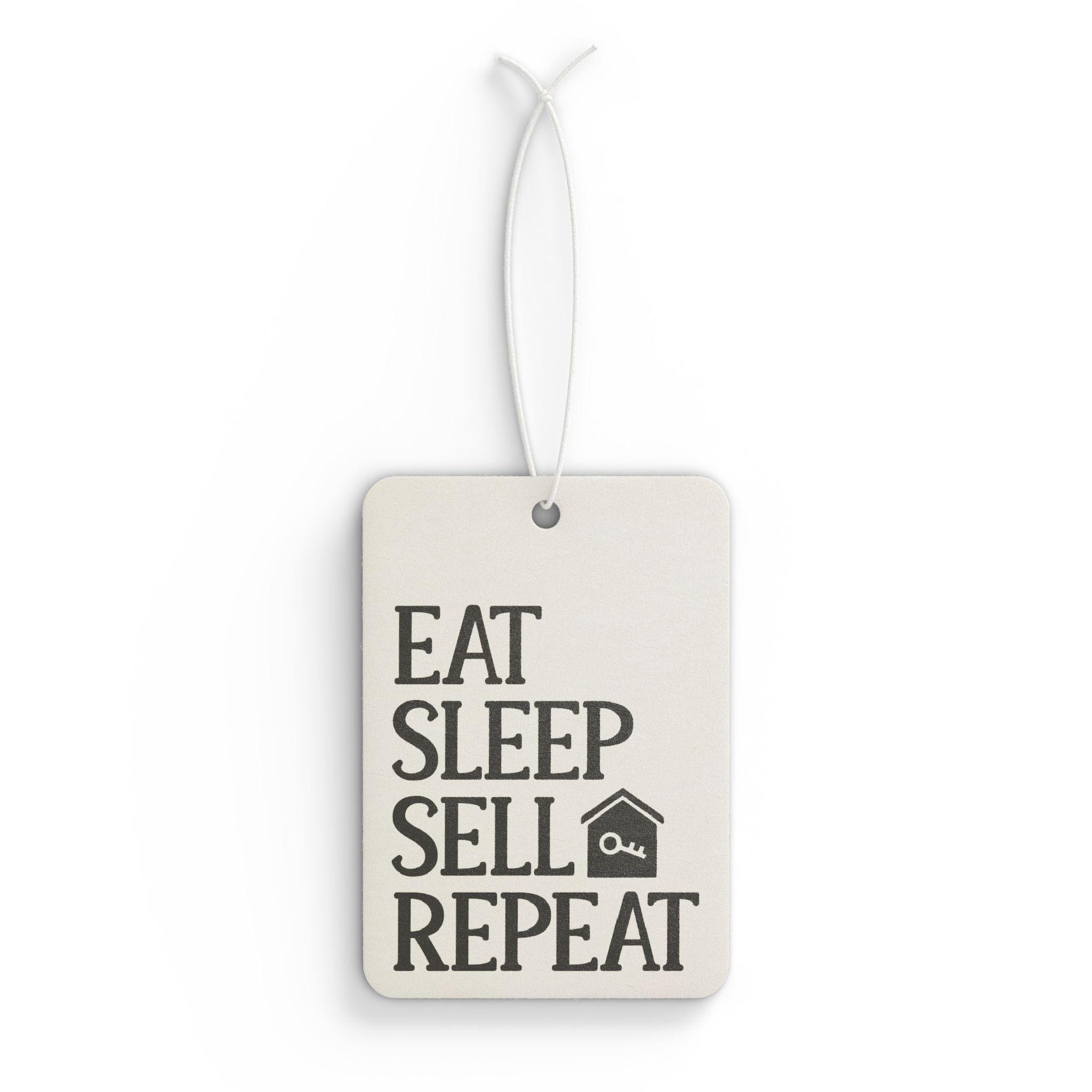Bring a little inspiration and fresh scent to every drive with this rectangular car air freshener. Bold, block typography reads “EAT SLEEP SELL REPEAT” with a simple house icon — a small, confident reminder for real estate pros, flippers, and side-hustle sellers. Choose from three curated fragrances: a crisp New Car blend with green fruit, ylang and leather; a calming Pine that evokes balsam fir and herbaceous greens; or Black Ice with bright citrus top notes for a modern, invigorating lift. Printed on sturdy 80 pt. paper board and duplicated on both sides, it hangs from a slim ribbon so the message and scent face forward whether it’s clipped to a rearview mirror or tucked into a space near the vents. It’s the kind of everyday detail that keeps your car smelling fresh and your mindset focused.